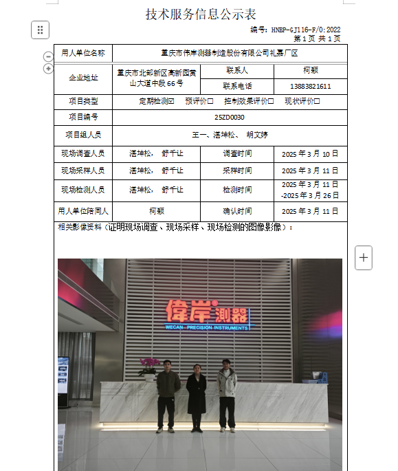 重庆市伟岸测器制造股份有限公司(礼嘉厂区)定期项目检测公示