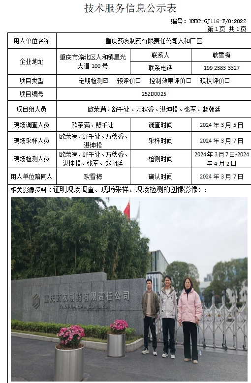 重庆药友制药有限责任公司人和厂区定期检测项目公示