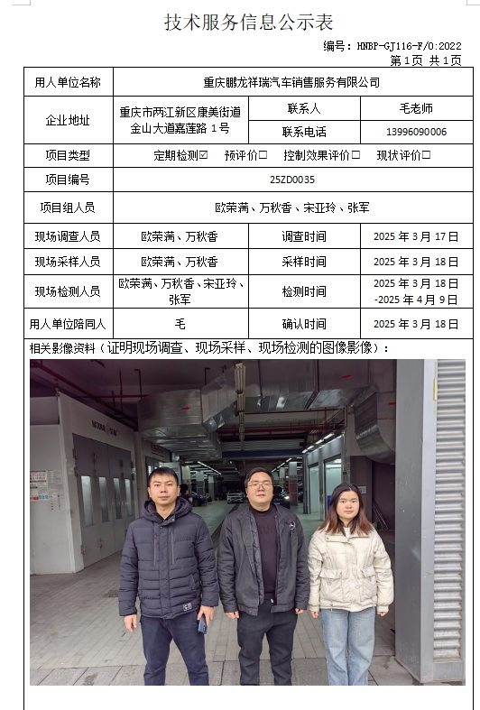 重庆鹏龙祥瑞汽车销售服务有限公司定期检测项目公示