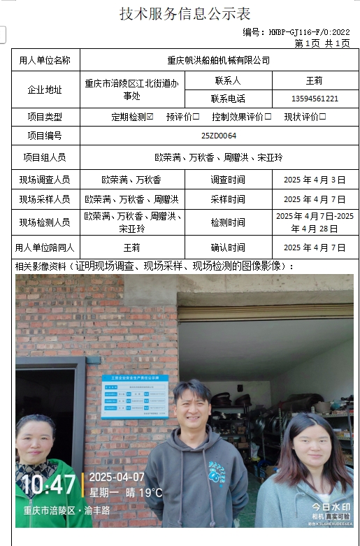 重庆帆洪船舶机械有限公司定期检测项目公示