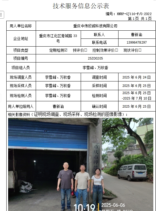 重庆中伟欣诚科技有限公司定期检测项目公示