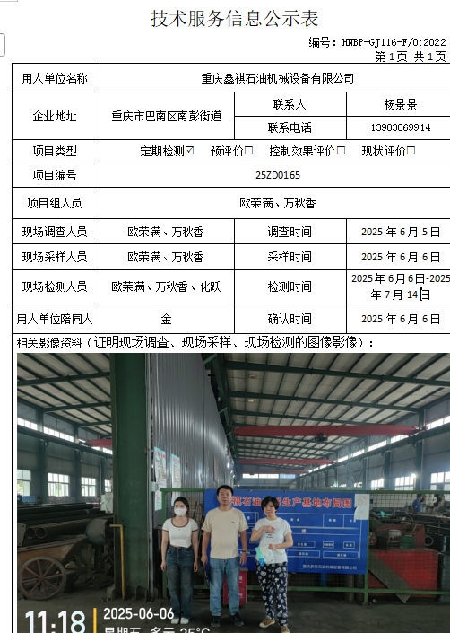 重庆鑫祺石油机械设备有限公司定期检测项目公示