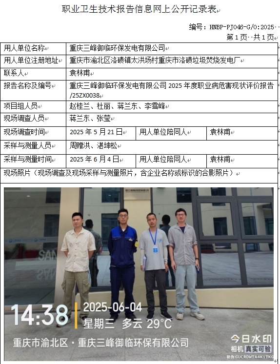 重庆三峰御临环保发电有限公司职业病危害现状评价报告项目公示