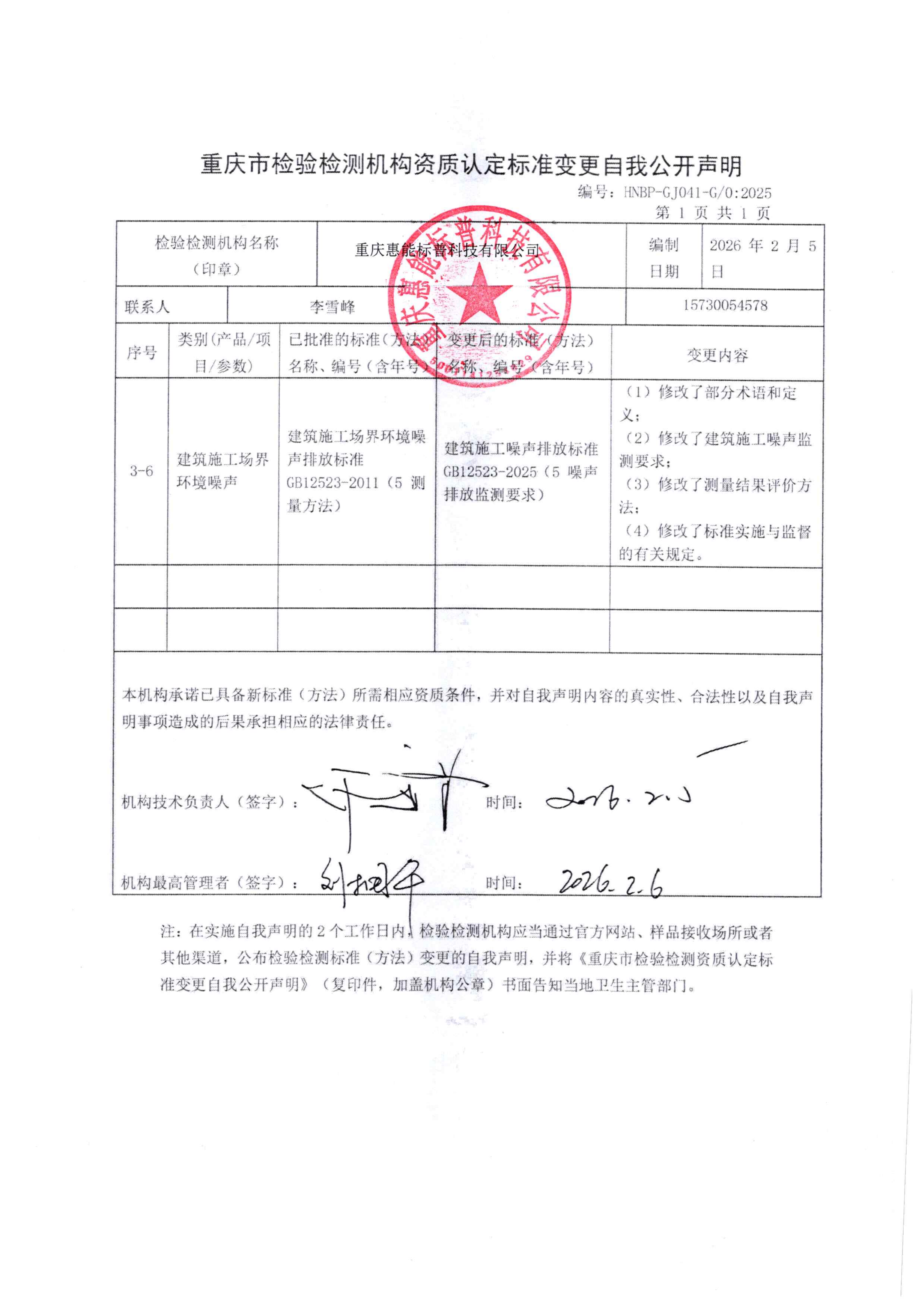 标准变更自我公开声明